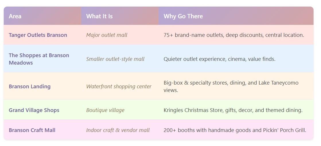 Even though only Tanger and Branson Meadows are true “outlet malls,” most 2026 shoppers also consider Branson Landing, Grand Village Shops, and Branson Craft Mall when planning their shopping day.