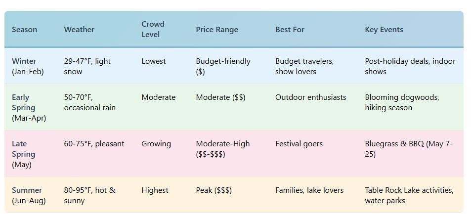 Summer (June-August) brings highs in the 80s-90s and peak crowds, but it's the best season for Table Rock Lake activities—boating, swimming, and fishing—making it worth the heat for water-focused trips.