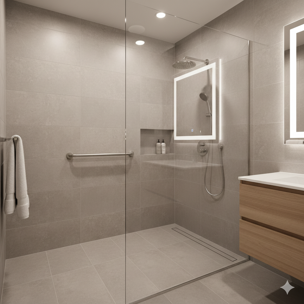 The bathroom is one of the most important spaces when it comes to accessibility. A walk-in or roll-in shower makes a big difference for safety and independence.