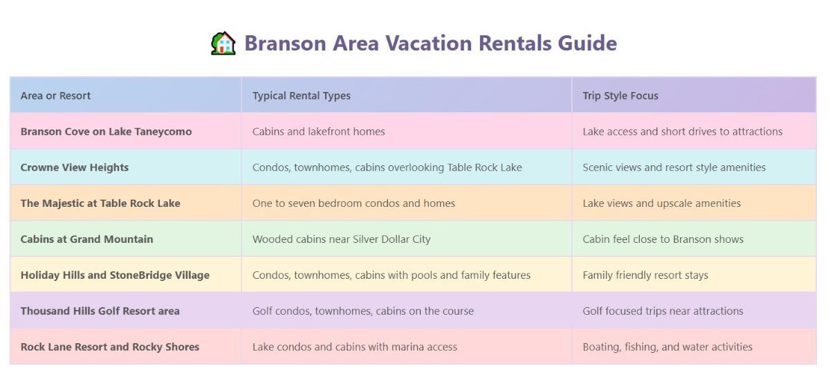 Branson vacation rentals include cabins, condos, townhouses, and lodges spread across lakefront, golf, and wooded resort communities. These properties range from cozy one bedroom condos for couples to large family lodges with four or more bedrooms for groups and multigeneration trips.