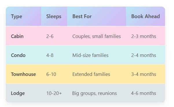 Not sure which property type fits your group? Here's a quick guide. For a deeper dive into each rental type, see our comprehensive guide to Branson vacation rentals.