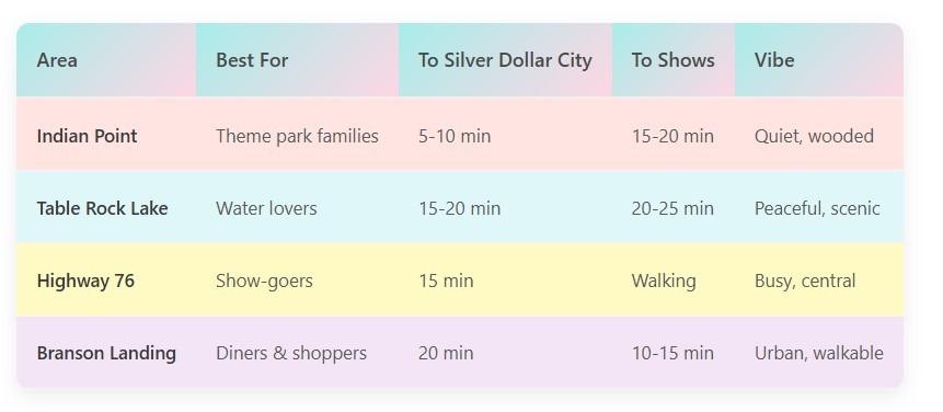 Choose this if: You like restaurants and shopping. The Landing is stroller-friendly with fountain shows at night. Urban feel with walkable dining. You'll drive 20 minutes to Silver Dollar City and 15 to the lake, but you're central to evening entertainment.