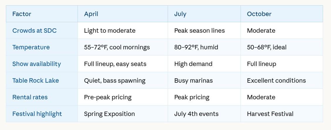 Adults planning April travel will find it useful to read through how each season in Branson plays out for different travel styles before committing to dates, but the short version for adults is this: April avoids school spring break overlap after mid-month, the show lineup is fully stocked, and rental rates have not yet climbed to summer highs. Booking early in April also gives you access to more availability on properties that will be heavily reserved through May and June.